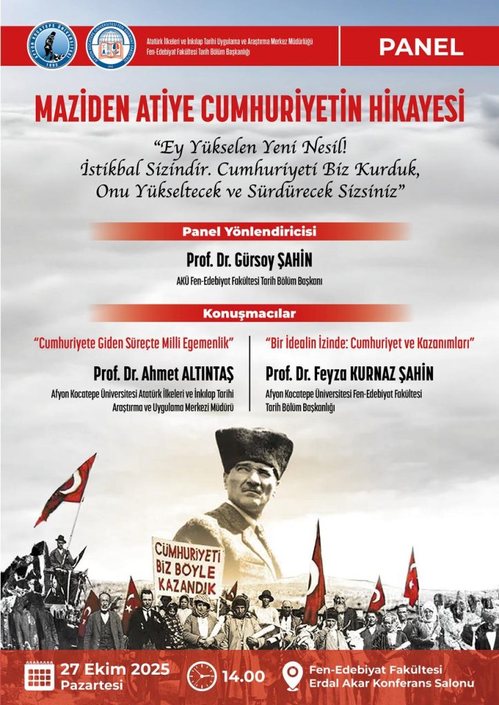 Fakültemiz Tarih Bölümü öğretim üyeleri Prof. Dr. Ahmet ALTINTAŞ, Prof. Dr. Feyza KURNAZ ŞAHİN ve Prof. Dr. Gürsoy ŞAHİN’in katılımı ile 27 Ekim 2025 Pazartesi günü saat 14.00’da “Maziden Atiye Cumhuriyetin Hikayesi” başlıklı bir panel düzenlenecektir.